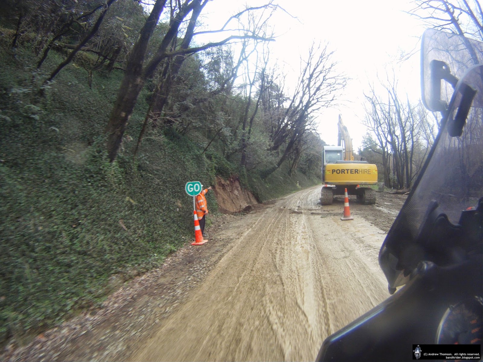 After we had clambered up the hill the road turned to gravel - well, sort of. The road was fairly hard packed but there had obviously been a fair bit of rain recently and there was a good layer of slippery mud to contend with. This made things fairly exciting for us - especially Philip on his new to him Tiger which was wearing Anakee 3's, not that ideal for the conditions. At least the GoPro was starting to play ball...